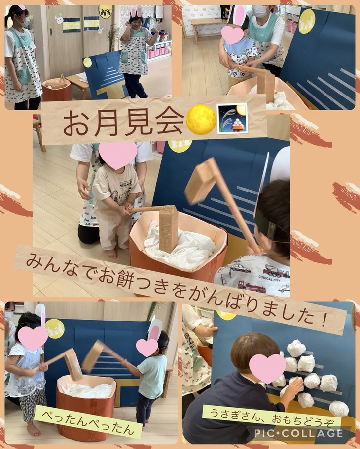 先生からお月見のお話を聞いてから〜!さっそくみんなでお餅つき!ぺったんぺったん美味しくなぁれ😋